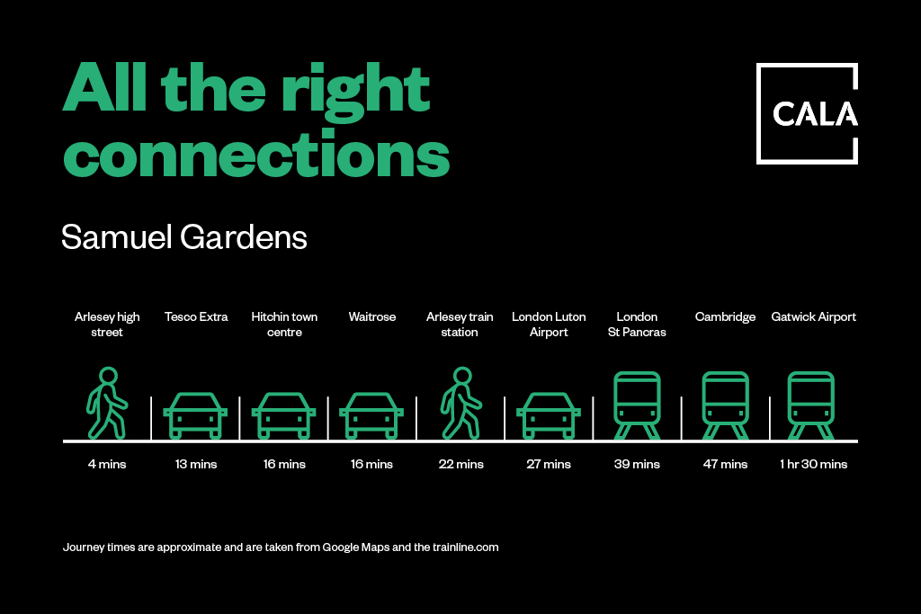 Arlesey lies just over 5 miles North of Hitchin and 4 miles north of Letchworth Garden City which offer a variety of amenities. Arlesey benefits from its own train station with a regular service into London taking 40 minutes. The station is a 15 minutes’ walk from the site. The site lies 4 miles west of junction 10 on the A1, approximately 10 minutes by car. There is a bus stop immediately outside the entrance to our phase 1 site with services to Hitchin and Bedford.We now have an established presence in the town with the acquisition of Phases 1, 2 and 3 and know the local market well.