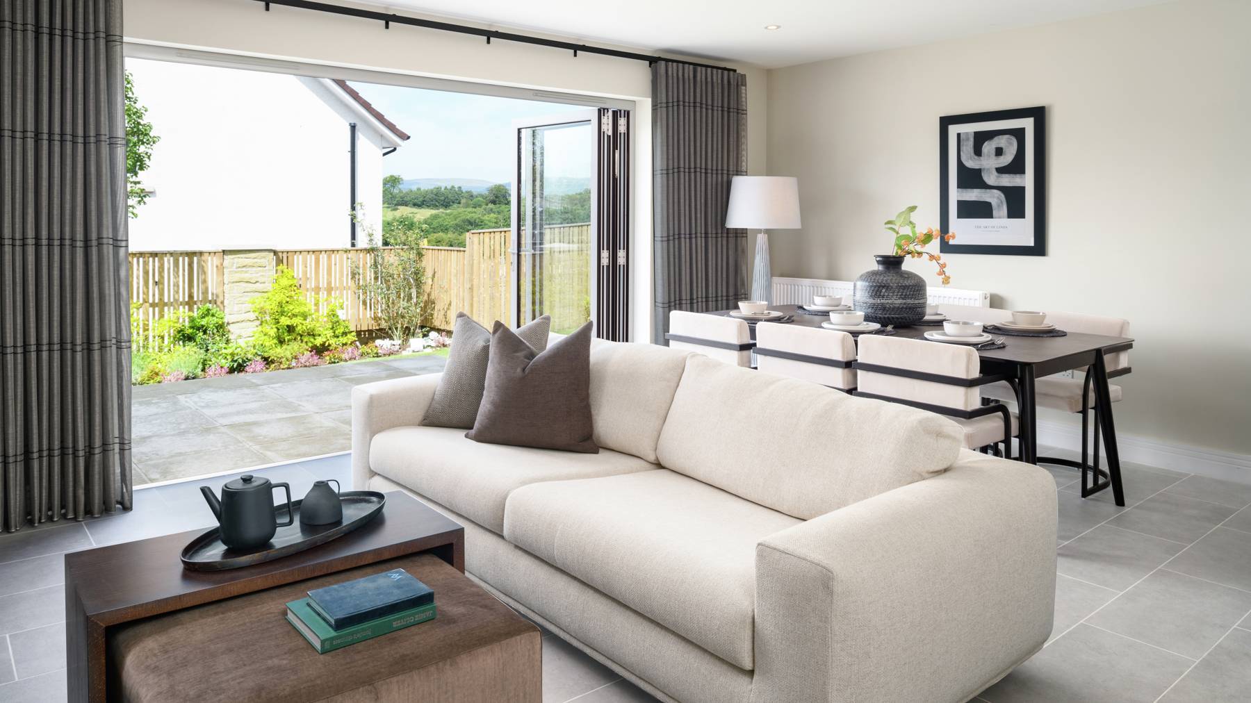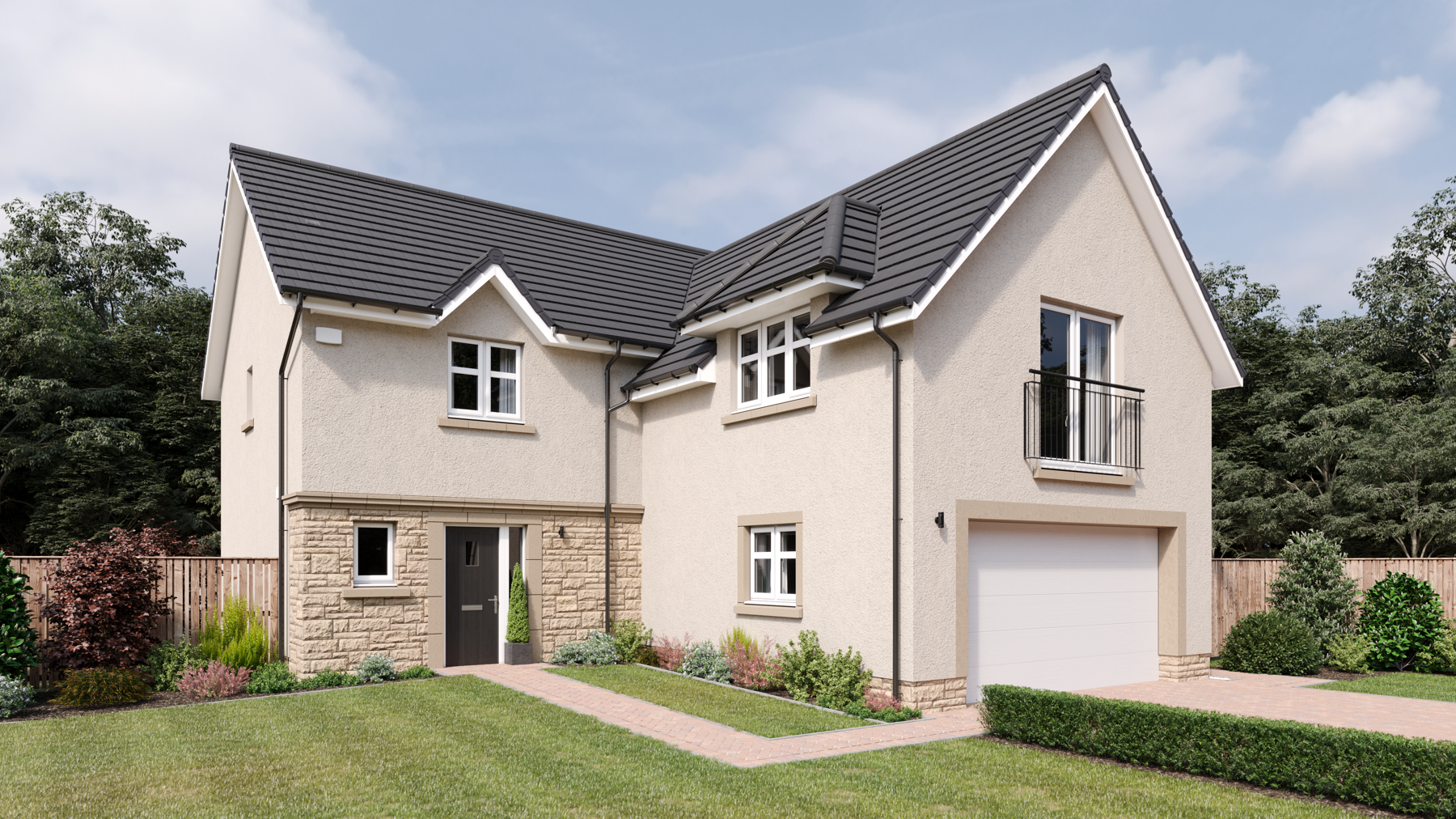 The Dewar is a spacious L-shaped, five-bedroom detached home designed for flexible family living. On the ground floor, a welcoming hallway leads to a formal lounge and an impressive open-plan kitchen, dining, and family room —both opening onto the rear garden via contemporary bi-fold/French doors. The stylish kitchen by Creative Designs features integrated Bosch appliances and peninsula island, perfect for entertaining or informal dining. A utility room, storage spaces, and a WC complete the downstairs.