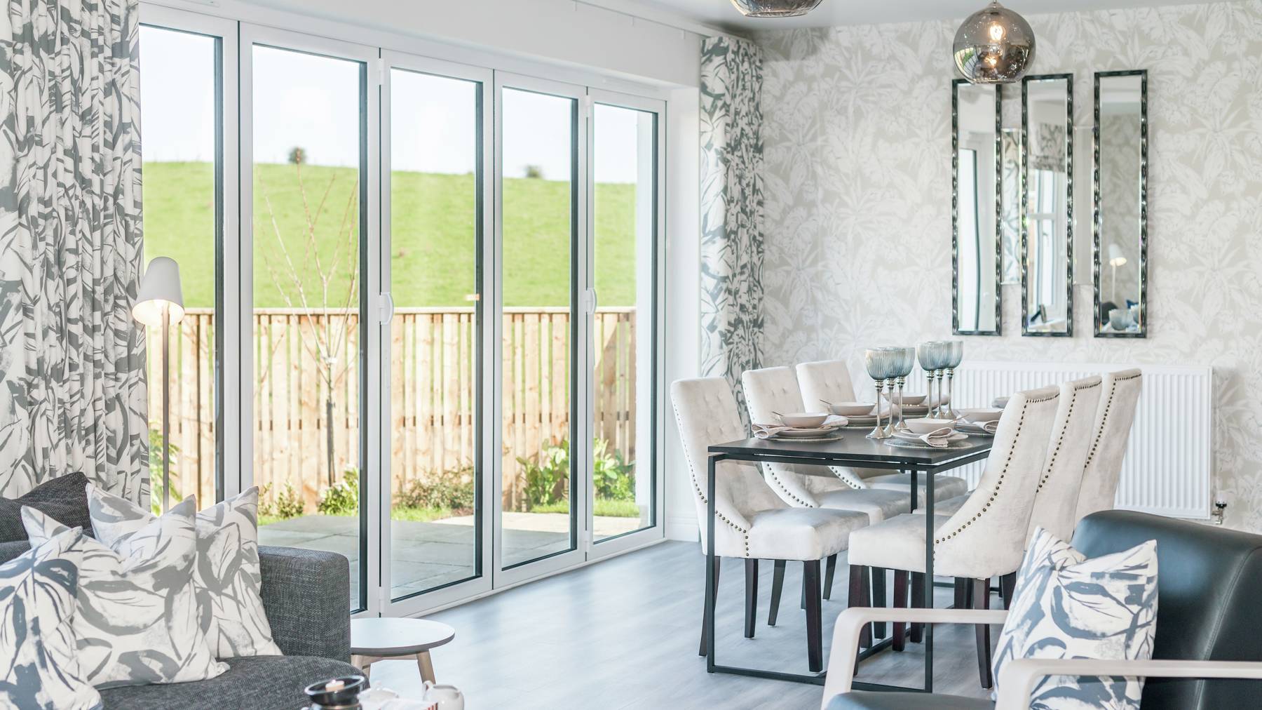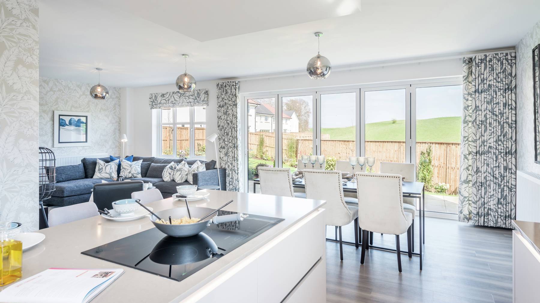 The impressive kitchen and family area enjoys a beautiful island with breakfast bar and lots of liveable space. Bi-fold doors ensure this stunning room is bathed in natural light.