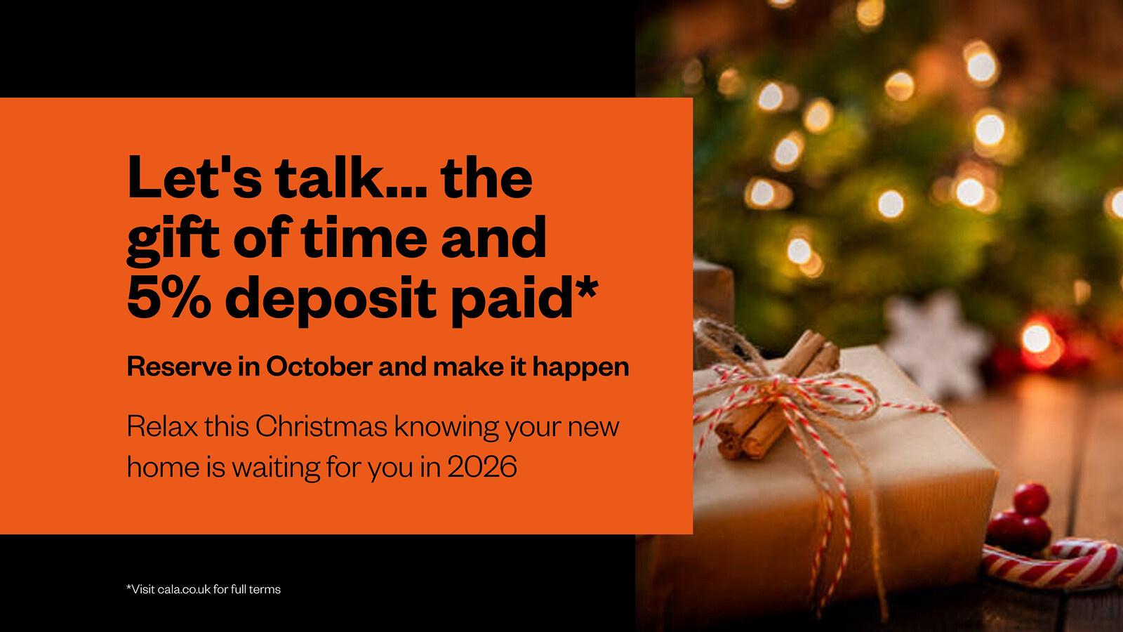 Get ready for the best Christmas ever, knowing you’ve secured a quality new Cala home with a 5% deposit payment* covered by Cala, when you reserve by 31st October. So start your celebrations early, and put your feet up over Christmas knowing the new home you really want will be yours next year. Let’s talk…