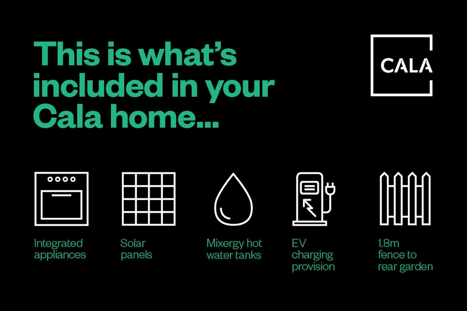 Photography may have been enhanced in post-production and may include upgrades at additional cost. Computer Generated Images may show features fittings, décor, flooring and soft furnishings which are not fitted as standard in a Cala home. CGIs are used to suggest possible finishes that can be achieved in your home at an additional cost. Please consult a Cala representative for further details. Predictive Energy Assessment and Energy Performance Certificate calculations in Scotland are changing. The specification and efficiency of our homes is not changing, but the EPC rating may, which could affect lending eligibility, particularly green mortgages. Visit www.cala.co.uk/epcscotland for more information or speak to a Cala sales representative.