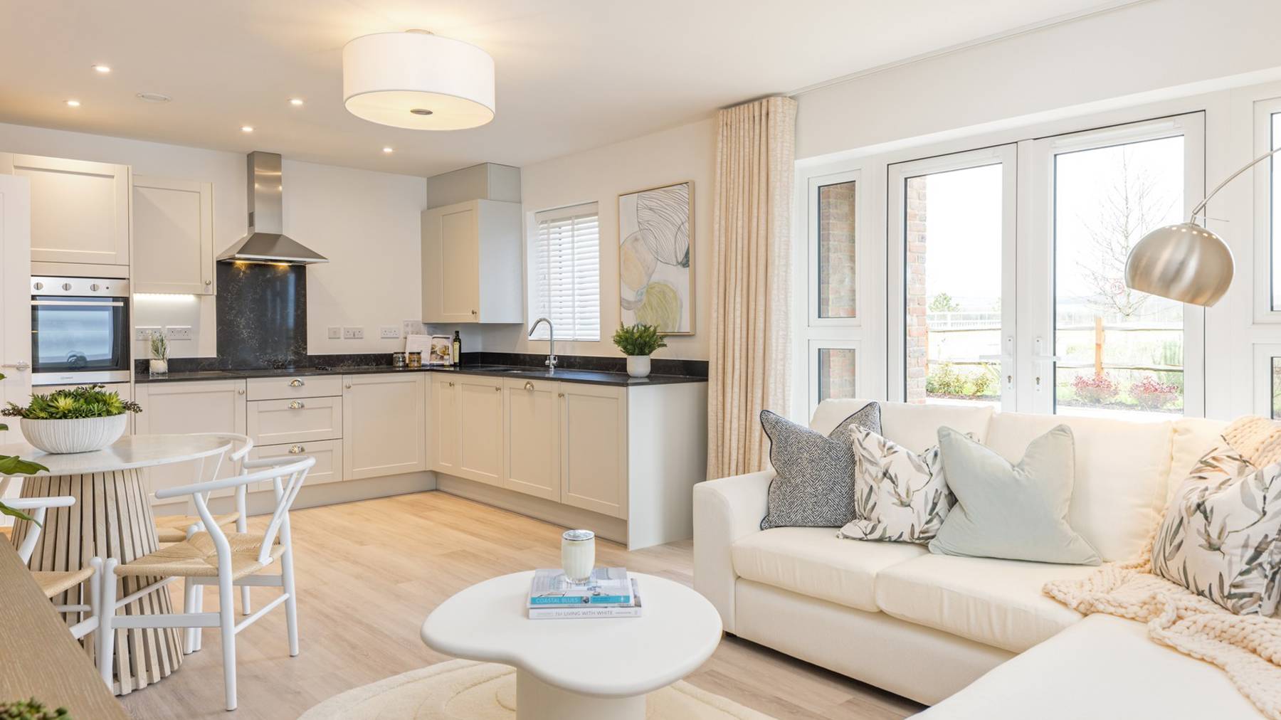 Open plan kitchen/living/dining space with plenty of natural light