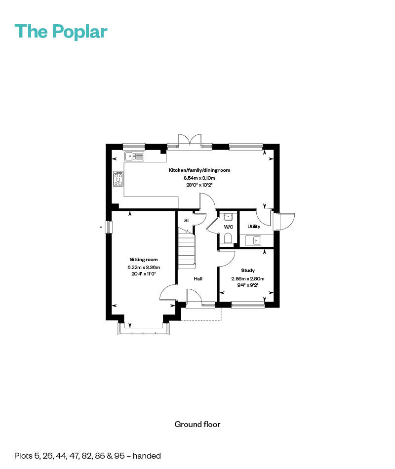 The Poplar is ideal for contemporary living on the grand scale, with a spacious sitting room for entertaining or relaxation. The full-width, fully fitted kitchen / dining / family room is the heart of the home, where you can cook, eat, spend quality time together, and in the summer, fling open the patio doors that extend into the garden. There’s a cloakroom, utility room and study, den or playroom too.