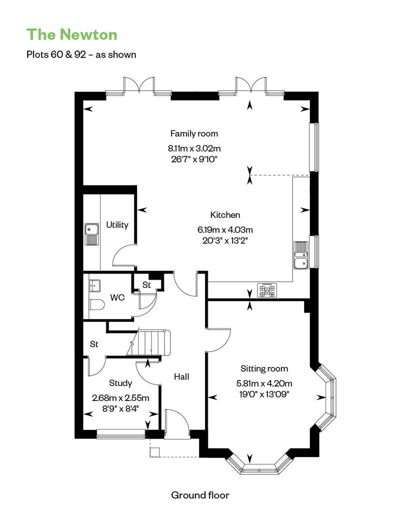 The ground floor also benefits from a large sitting room with two bay windows, a study, WC and storage space.