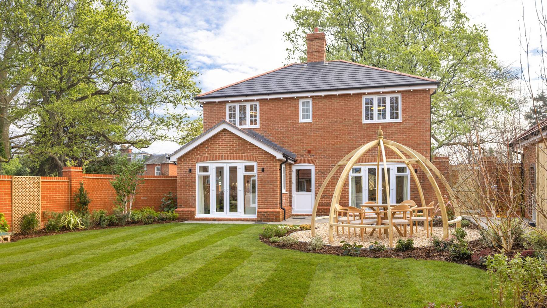 The expansive, triple aspect kitchen/dining/family room is perhaps the most impressive of the downstairs interiors, with integrated Bosch appliances, Amtico flooring and French doors opening out to the garden at the end. On the other side of the hall is the spacious sitting room, also with French doors leading out to the fully-lawned garden, and there is a light-filled, separate study at the front of the home.