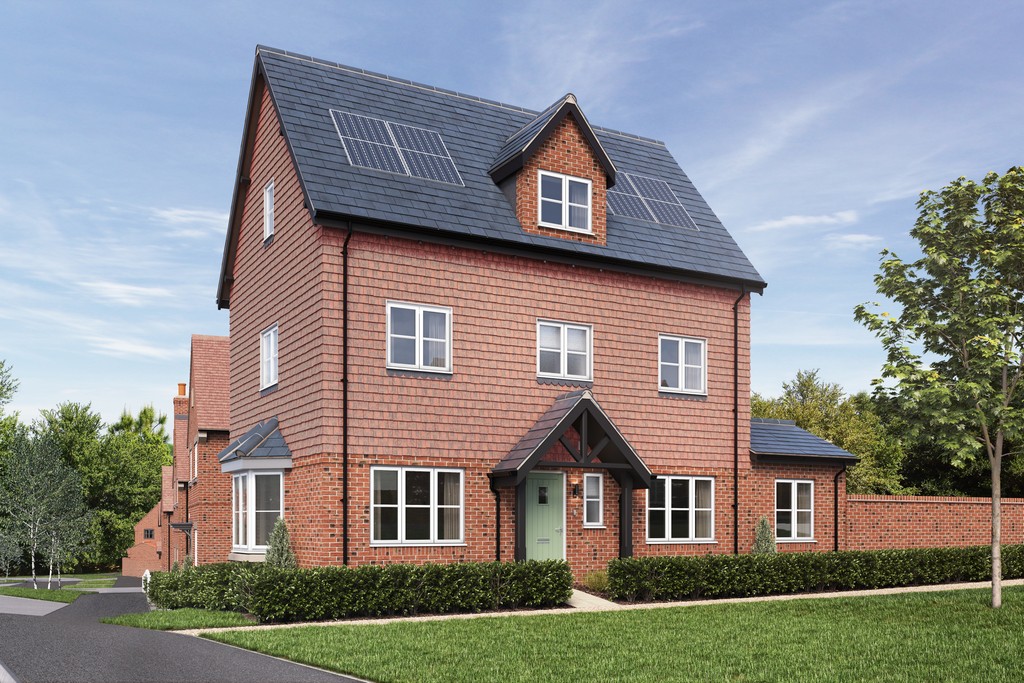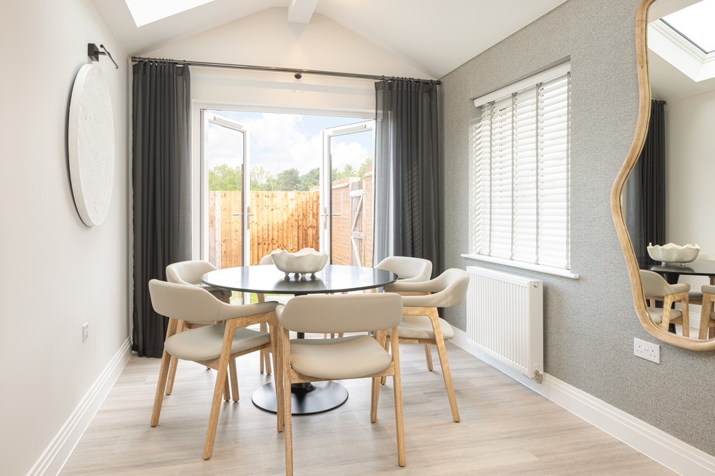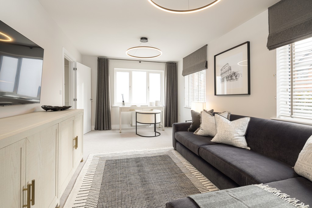 The ground floor features living spaces that will more than meet the demands of contemporary family lifestyles, with an expansive, dual aspect sitting room on one side, featuring a large bay window that lets in plenty of natural light. On the other side of the hall is the kitchen/dining/family room, complete with integrated Bosch appliances and opening out to the fully-lawned garden through French doors.