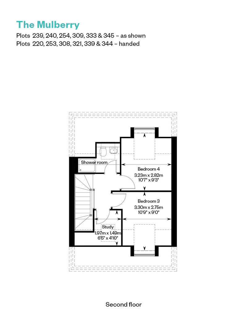 Offering flexible living over three floors, The Mulberry accommodates everyone in contemporary comfort. A spacious open plan kitchen/dining room/ family room with French doors shares the ground floor with an impressive vaulted ceiling skylight. Upstairs provides a real sanctuary, where you can relax in two double bedrooms, a private dressing room and en suite to bedroom one, as well as the shared family bathroom for bedroom two. Or escape to two more bedrooms on the second floor, which has a shower room off of bedroom four and a joint study to share. Includes a garage and 2 parking spaces.