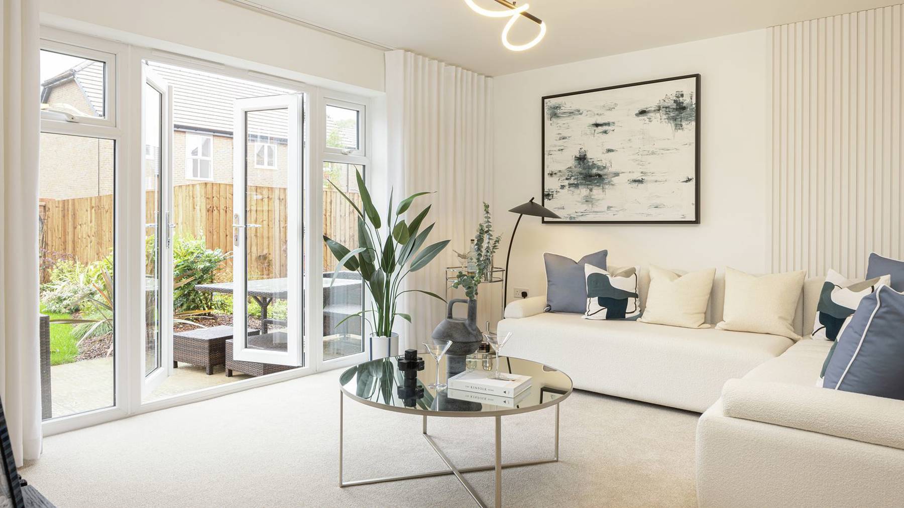 As you enter, just off from the hall you'll find a generous kitchen at the front of this home with plenty of worktop space and the latest integrated appliances. Wander along the elegant hallway past the downstairs WC and you will find the sitting/dining room and a large window and double patio doors allowing light to flood in. The ground floor is completed with 2 storage cupboards.