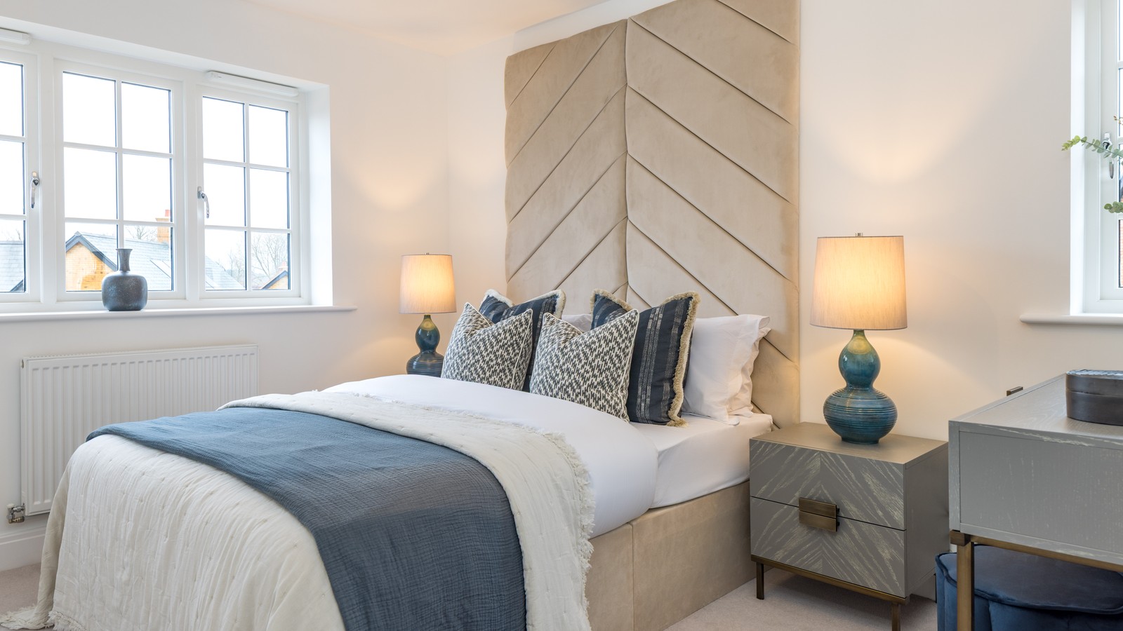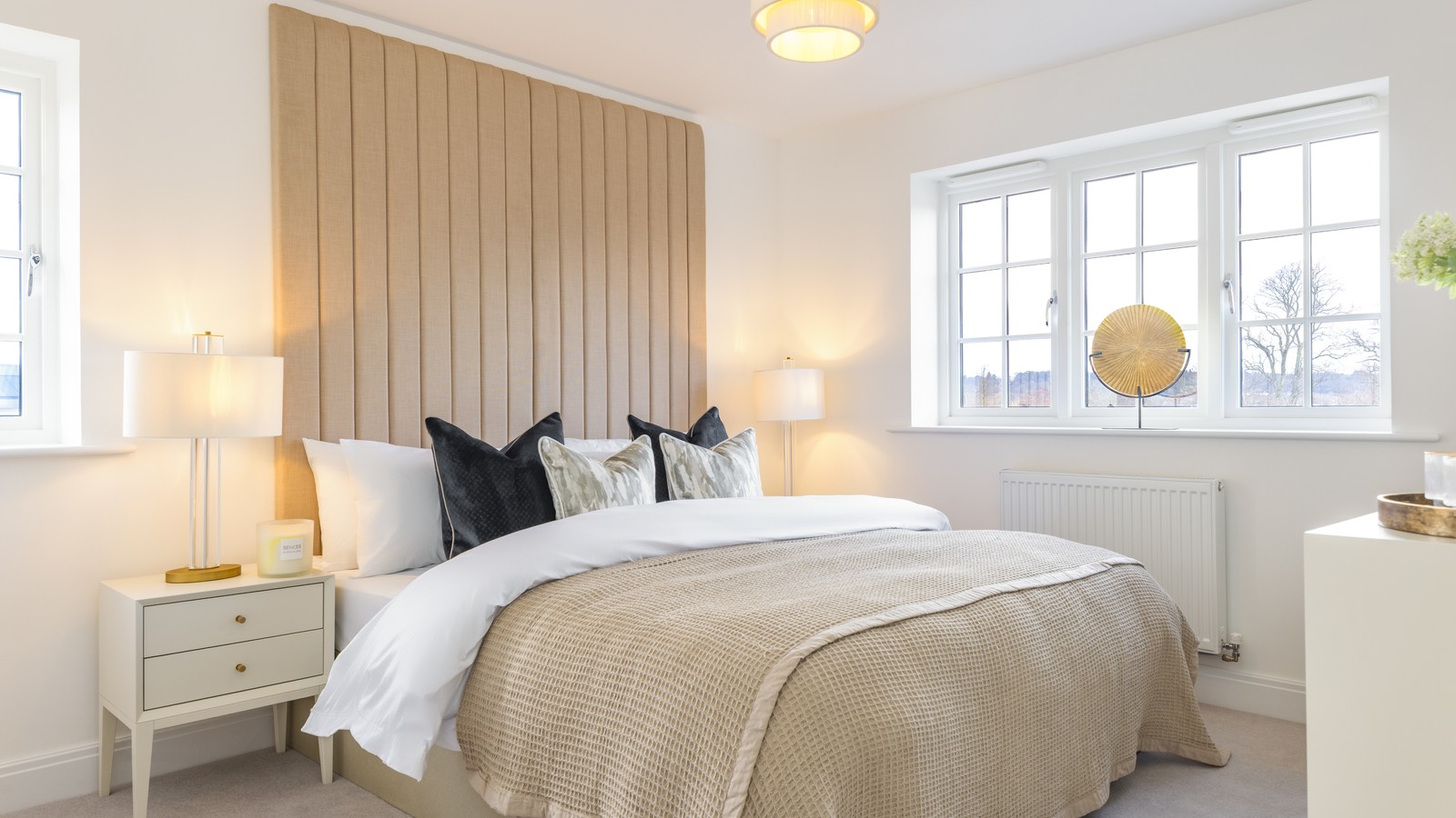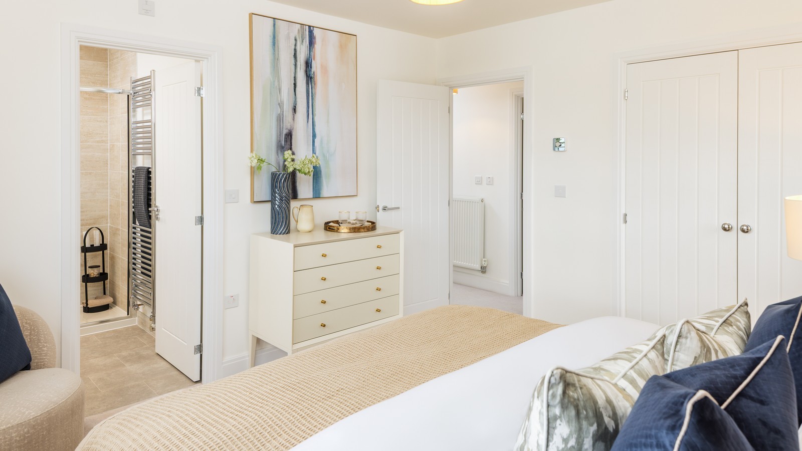 - Light‑filled primary bedroom with fitted wardrobe and private en‑suite featuring a VADO shower with glass door.